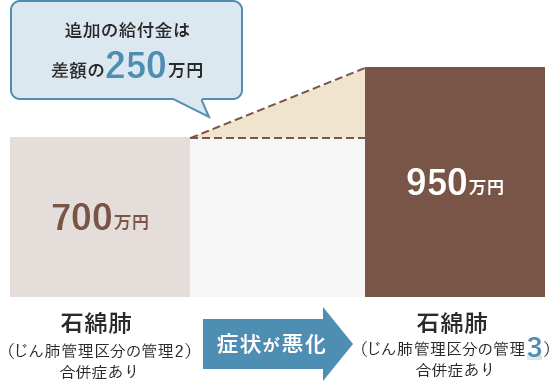 アスベスト(石綿)に起因する病態に応じて、550万円~1,300万円の給付金が受け取れます。